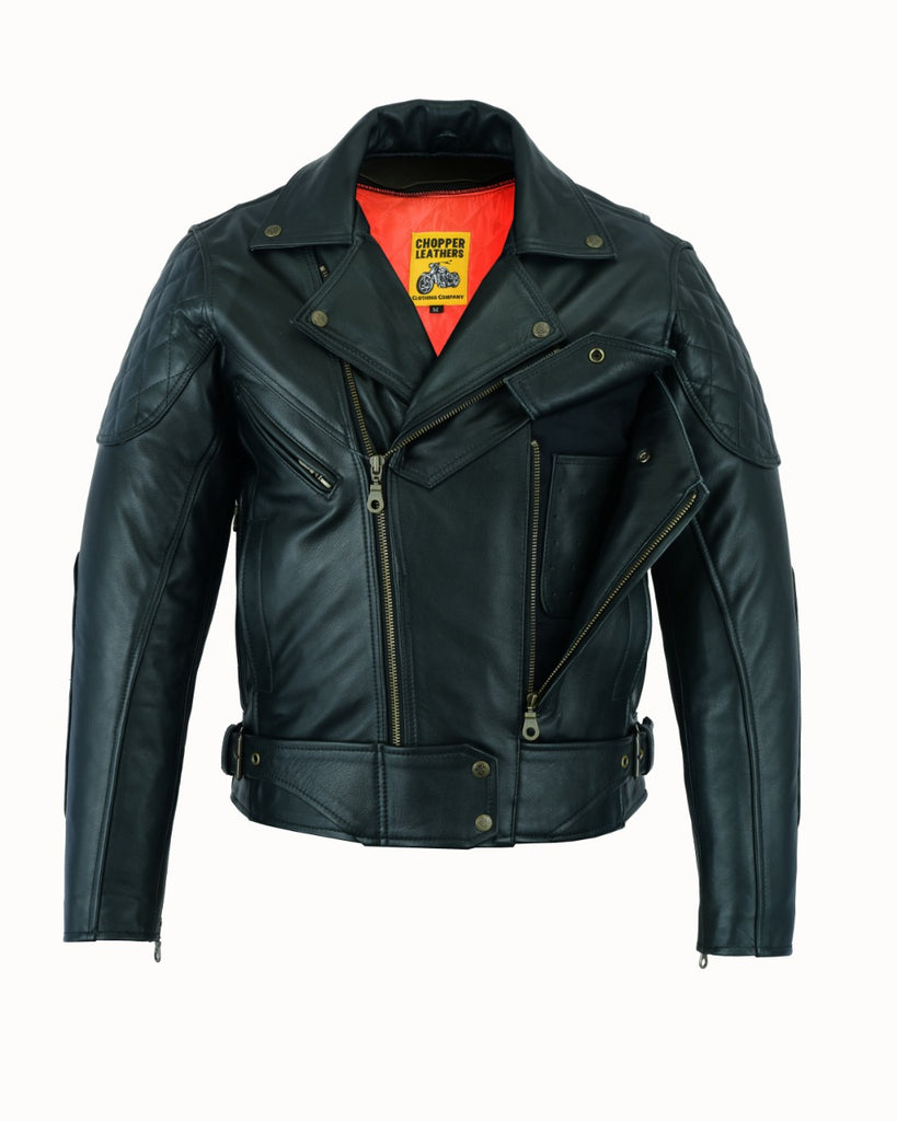 Made in soft natural cowhide 1.2/3MM detachable inner lining comfortable, breathable red inner lining.pocket for CE protectors at shoulder and elbow and special foam padding at back